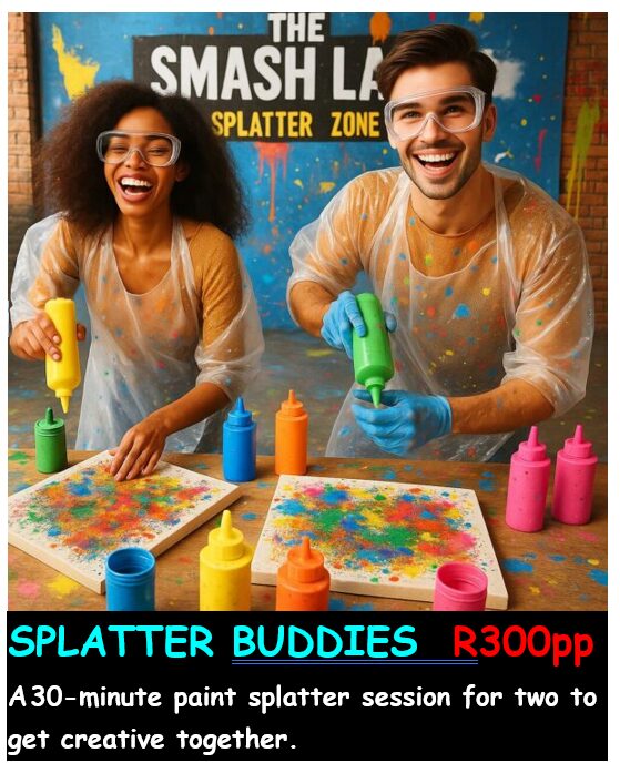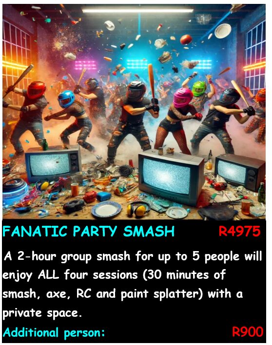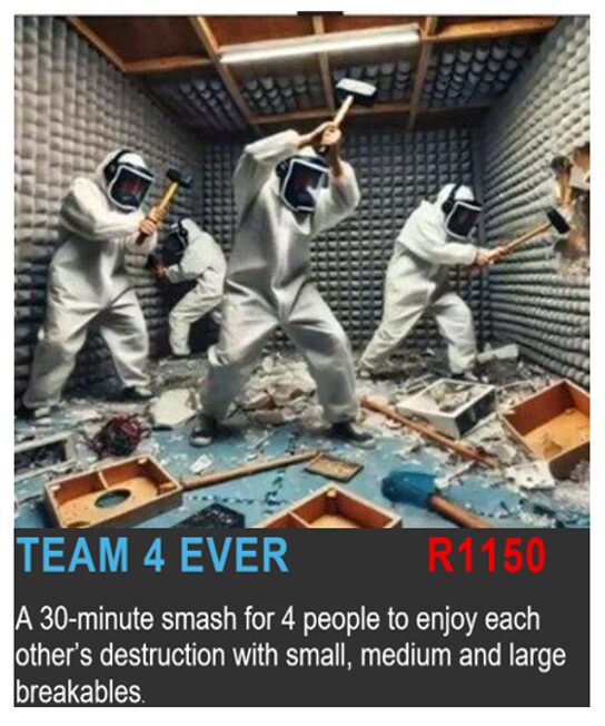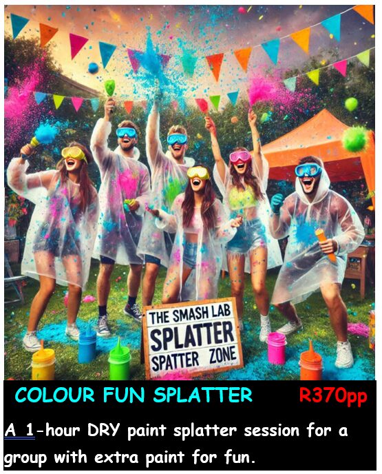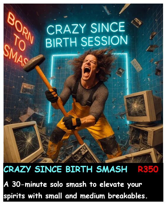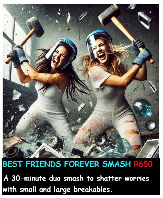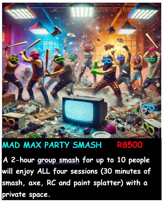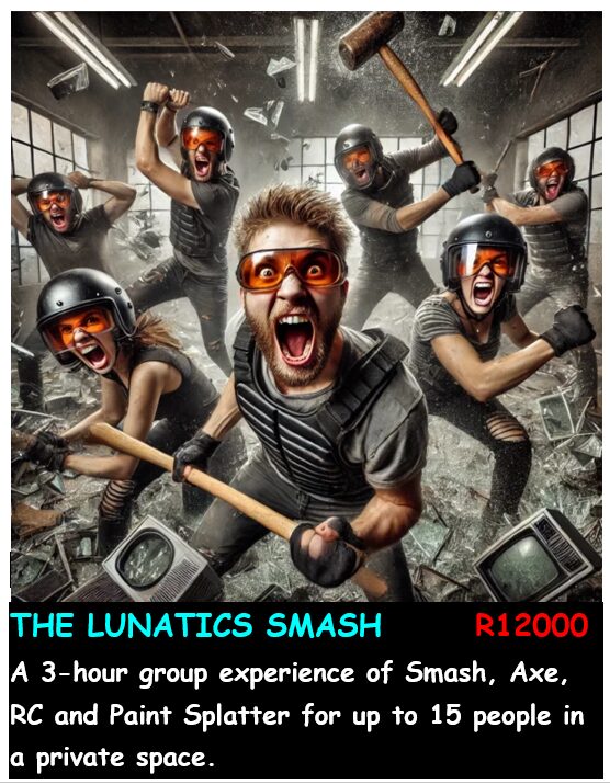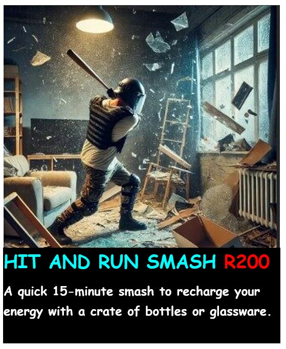 Ready to unleash your inner chaos? At The Smash Lab at corner of Lynnwood and Meadow street , Equestria, Pretoria East, our Smashing Packages let you break free and have a blast!