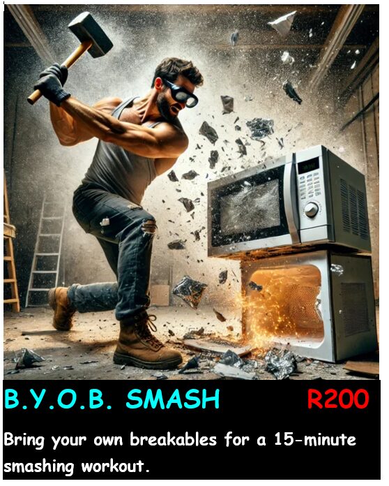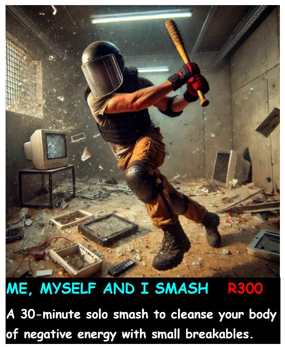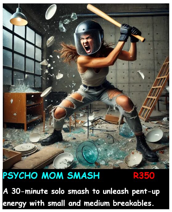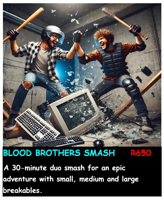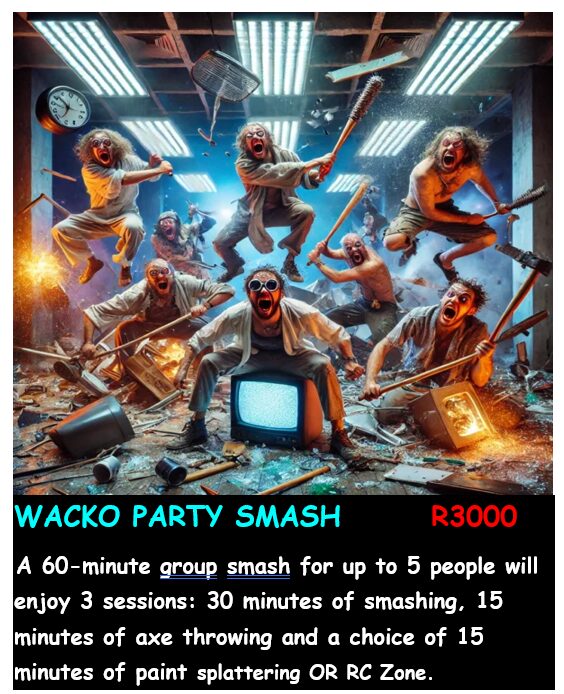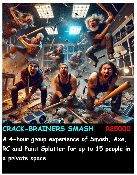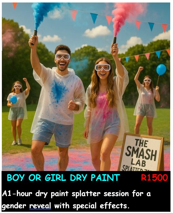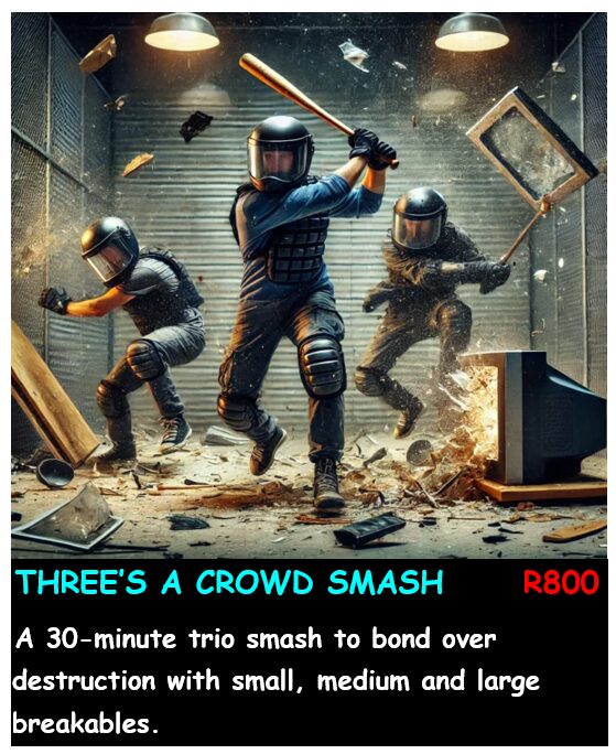 Ready to unleash your inner chaos? At The Smash Lab at corner of Lynnwood and Meadow street , Equestria, Pretoria East, our Smashing Packages let you break free and have a blast!